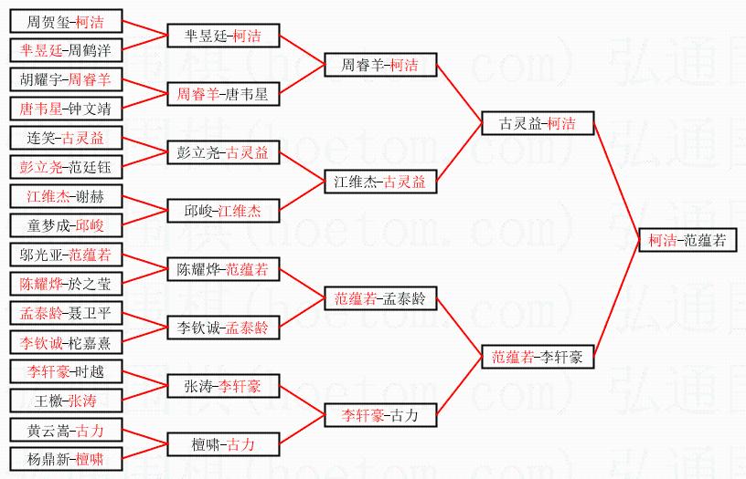 1.柯洁获得冠军,范蕴若获得亚军。决赛比分:柯洁1:0范蕴若。棋局: