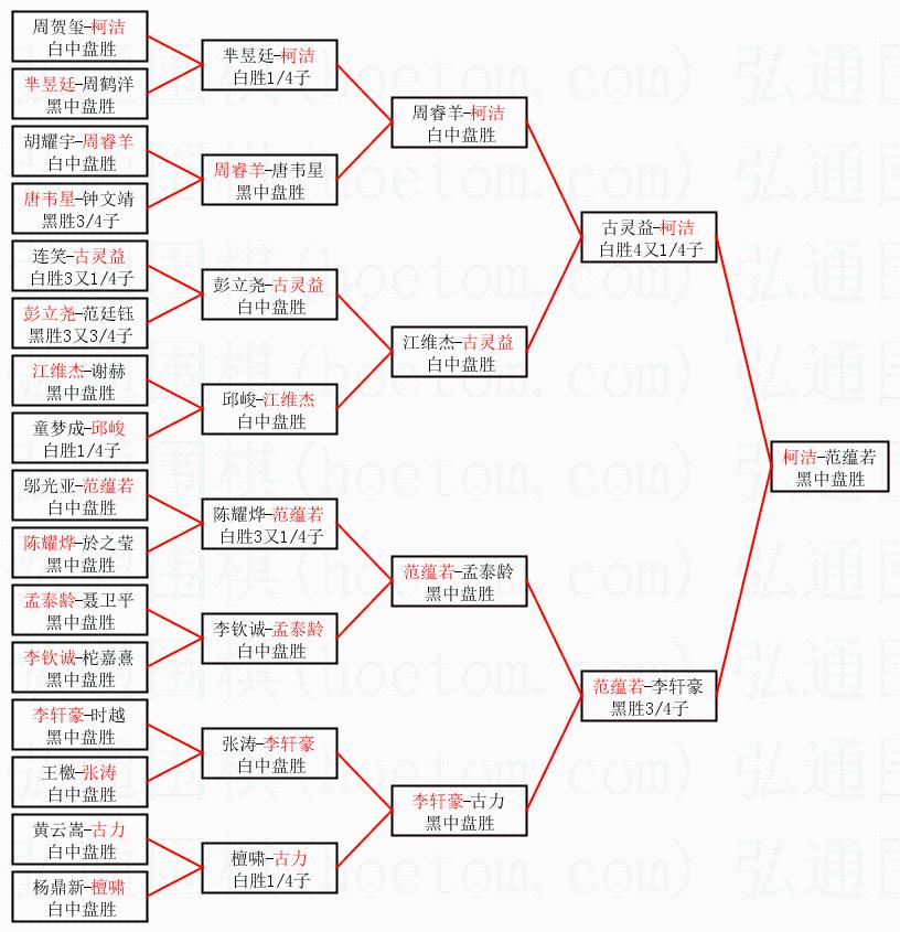 1.柯洁获得冠军,范蕴若获得亚军。决赛比分:柯洁1:0范蕴若。棋局: