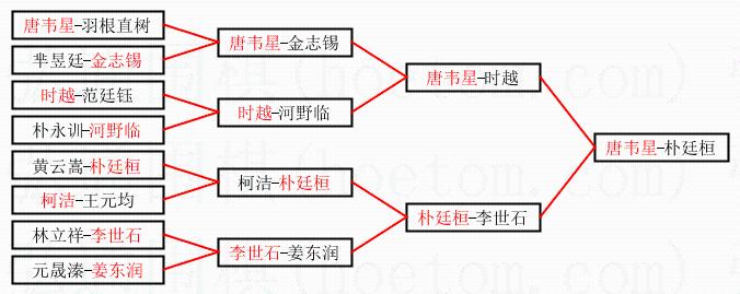 1.唐韦星获得冠军,朴廷桓获得亚军。决赛比分:唐韦星3:2朴廷桓。棋局: