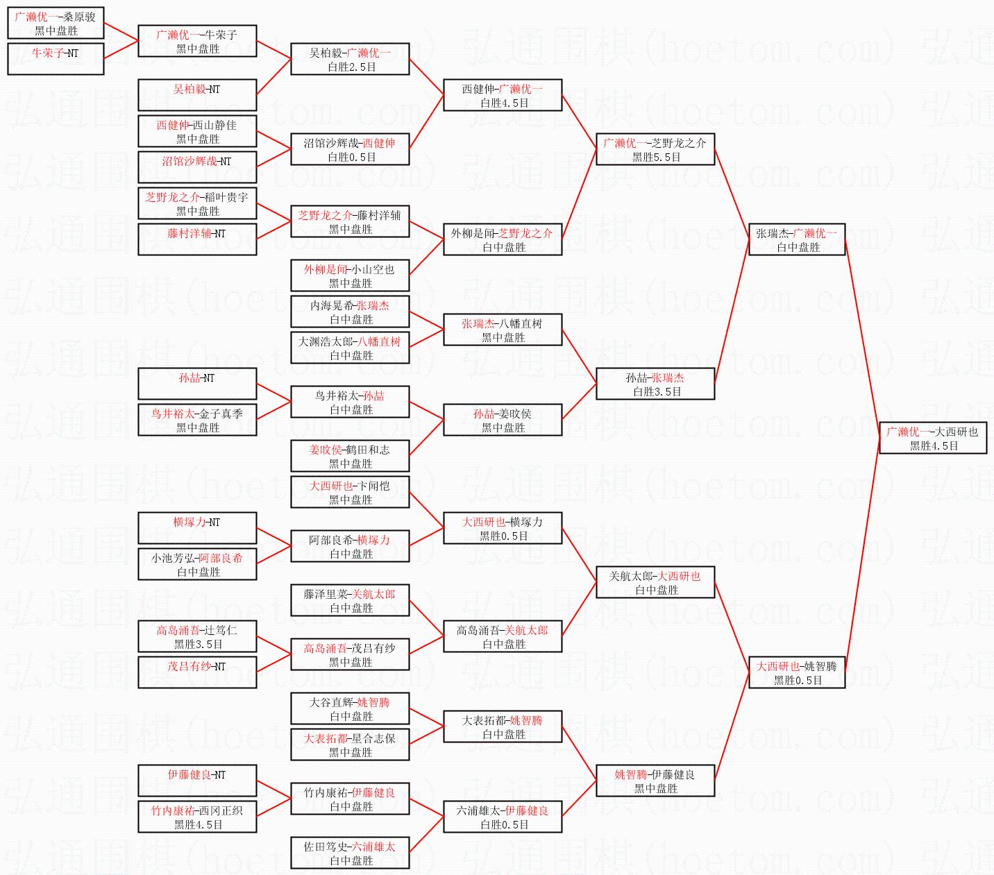 2.上半区半决赛广濑优一获胜, 比分:广濑优一 1:0 张瑞杰。棋局: