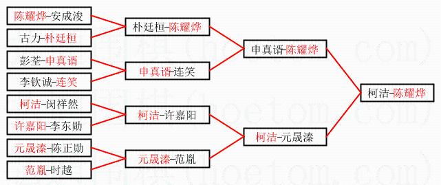 | 1.陈耀烨获得冠军,柯洁获得亚军。决赛比分:陈耀烨3:1柯洁。棋局: | ||