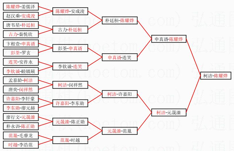 | 1.陈耀烨获得冠军,柯洁获得亚军。决赛比分:陈耀烨3:1柯洁。棋局: | ||