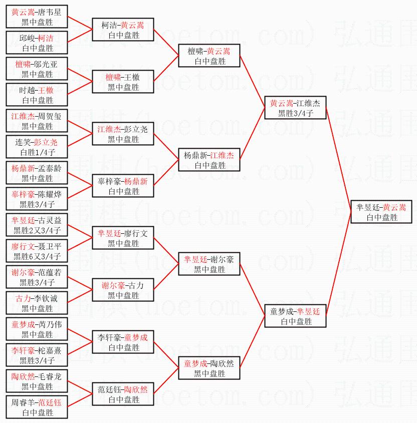 2.上半区半决赛黄云嵩获胜, 比分:黄云嵩 1:0 江维杰。棋局:
