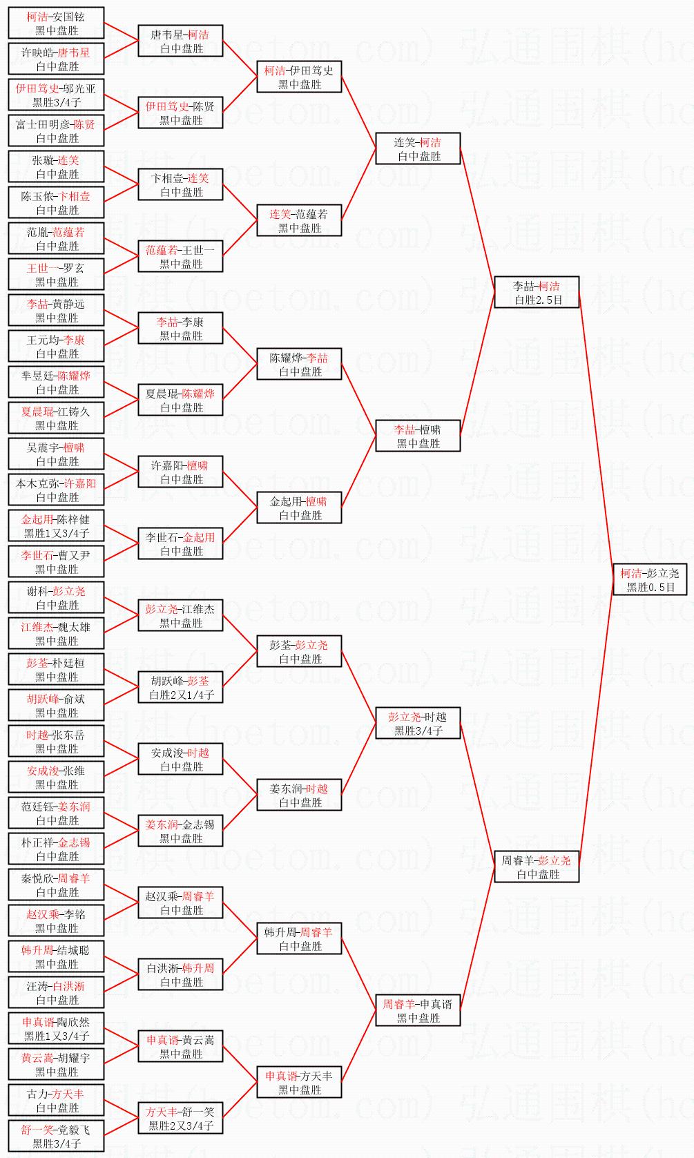 1.柯洁获得冠军,彭立尧获得亚军。决赛比分:柯洁3:2彭立尧。棋局: