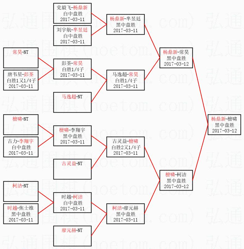 2.上半区半决赛杨鼎新获胜, 比分:杨鼎新 1:0 常昊。棋局: