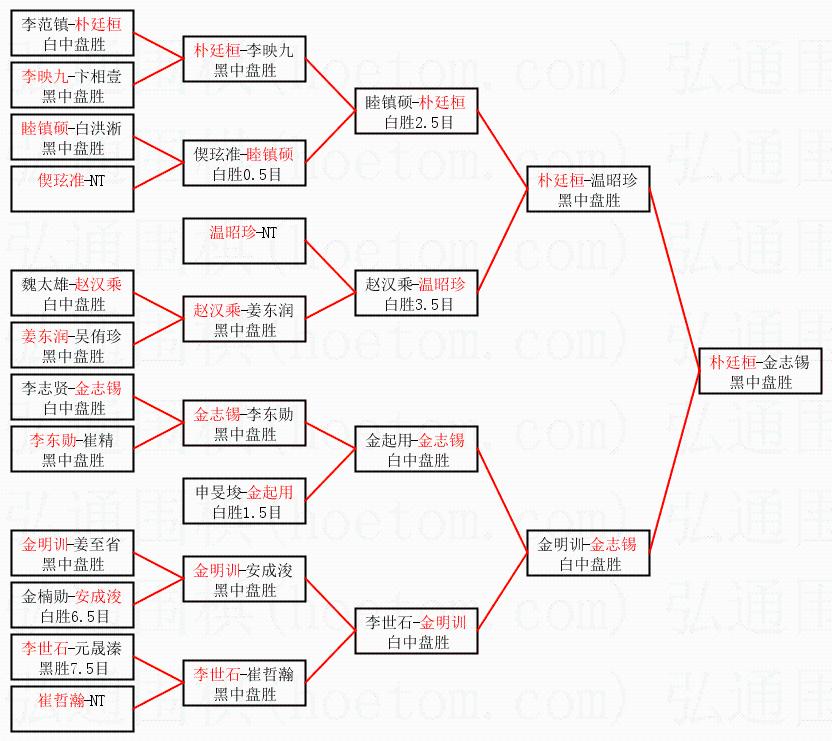 1.朴廷桓获得冠军,金志锡获得亚军。决赛比分:朴廷桓2:0金志锡。棋局: