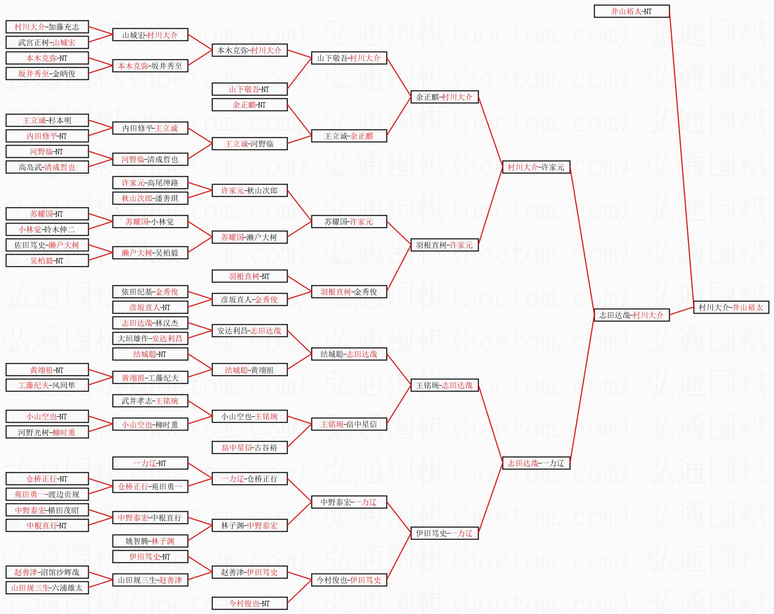 1.井山裕太获得冠军,村川大介获得亚军。决赛比分:井山裕太3:0村川大介。棋局: