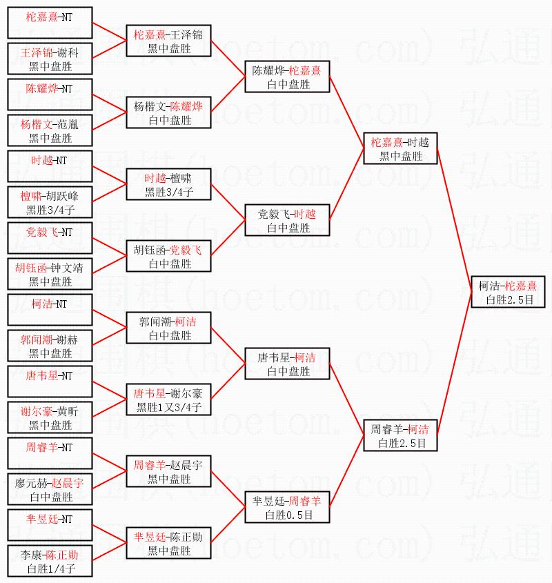 1.柁嘉熹获得冠军,柯洁获得亚军。决赛比分:柁嘉熹1:0柯洁。棋局: