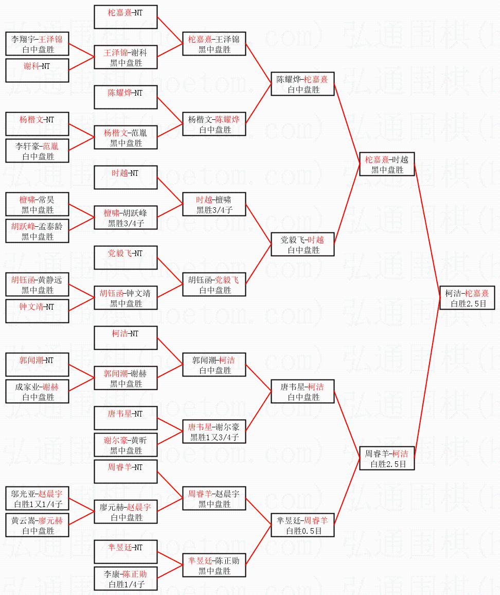 1.柁嘉熹获得冠军,柯洁获得亚军。决赛比分:柁嘉熹1:0柯洁。棋局: