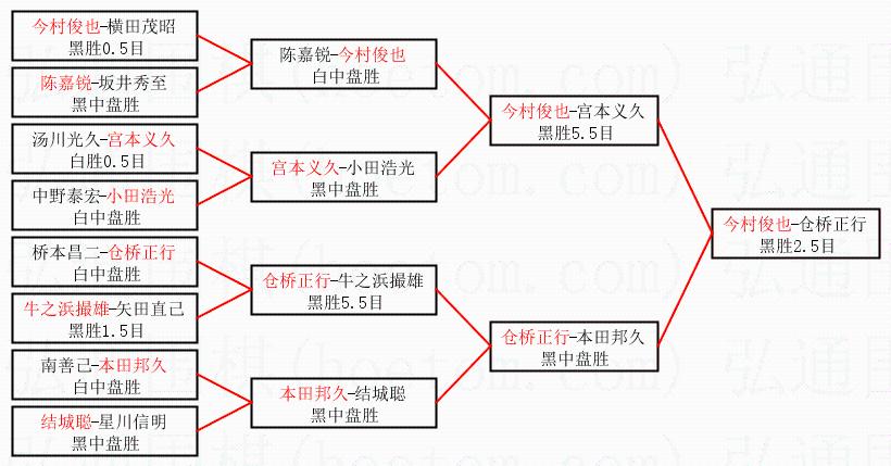 1.今村俊也获得冠军,仓桥正行获得亚军。决赛比分:今村俊也2:1仓桥正行。棋局: