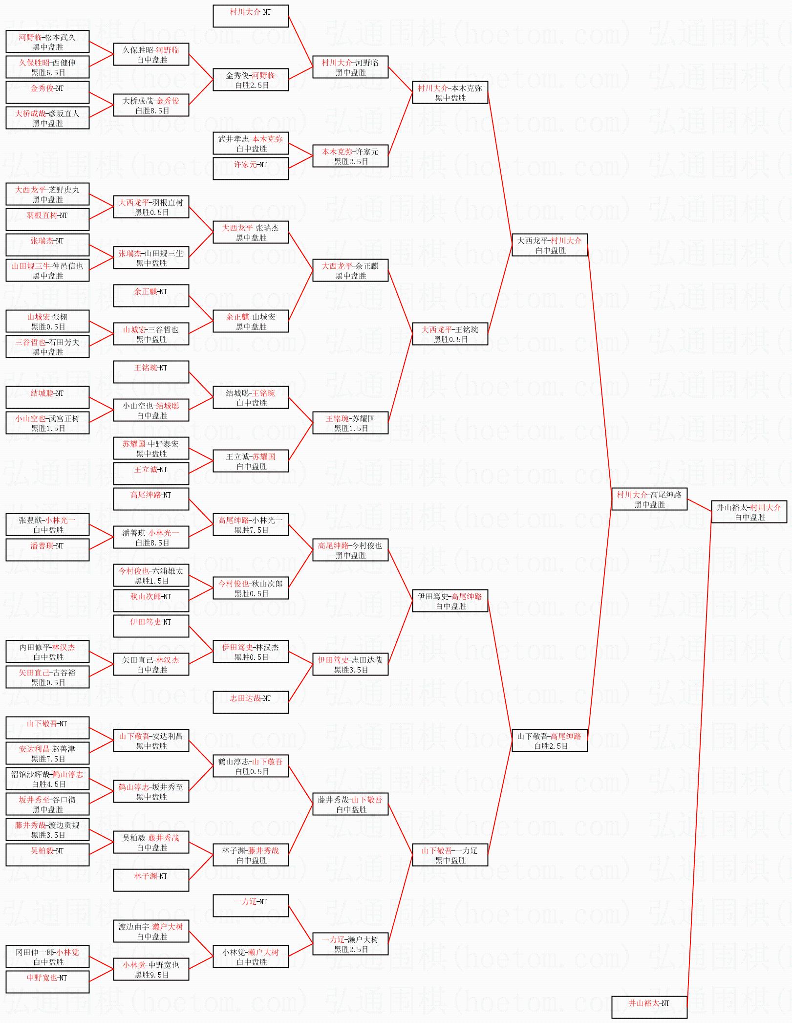 1.村川大介获得冠军,井山裕太获得亚军。决赛比分:村川大介3:1井山裕太。棋局: