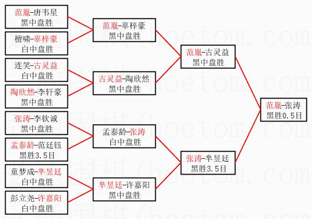 1.范胤获得冠军,张涛获得亚军。决赛比分:范胤1:0张涛。棋局: