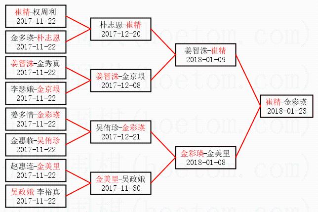 1.崔精获得冠军,金彩瑛获得亚军。决赛比分:崔精2:0金彩瑛。棋局: