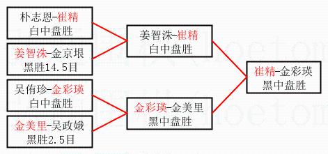 1.崔精获得冠军,金彩瑛获得亚军。决赛比分:崔精2:0金彩瑛。棋局: