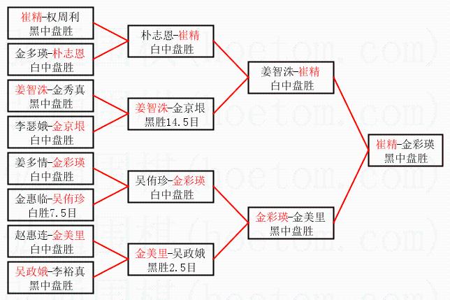 1.崔精获得冠军,金彩瑛获得亚军。决赛比分:崔精2:0金彩瑛。棋局: