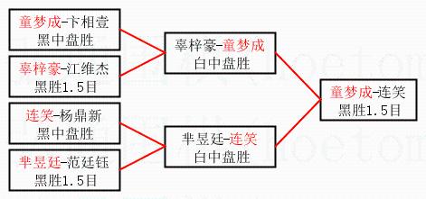 1.童梦成获得冠军,连笑获得亚军。决赛比分:童梦成1:0连笑。棋局: