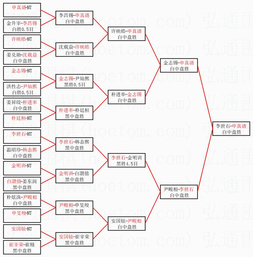 1.申真谞获得冠军,李世石获得亚军。决赛比分:申真谞3:2李世石。棋局: