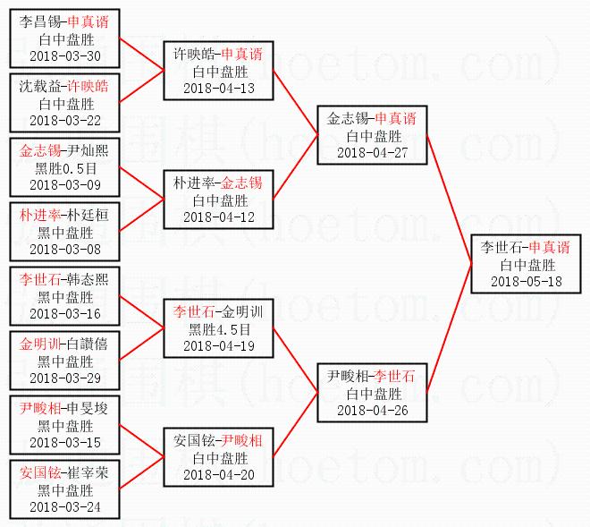 1.申真谞获得冠军,李世石获得亚军。决赛比分:申真谞3:2李世石。棋局: