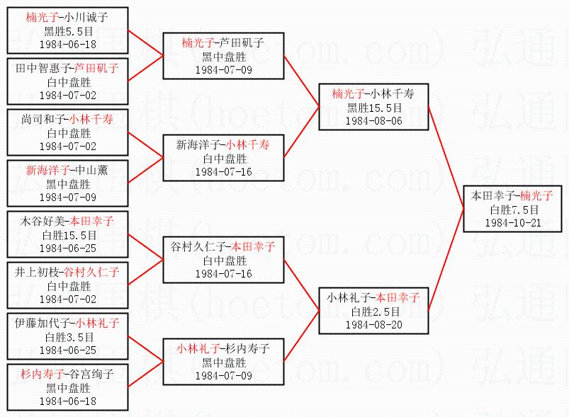 1.楠光子获得冠军,本田幸子获得亚军。决赛比分:楠光子1:0本田幸子。棋局:
