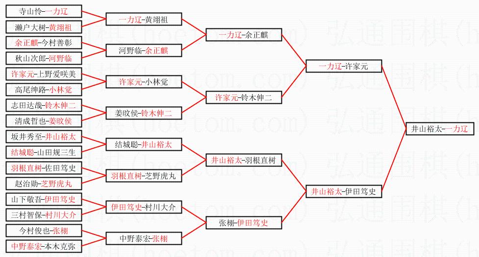 1.一力辽获得冠军,井山裕太获得亚军。决赛比分:一力辽1:0井山裕太。棋局: