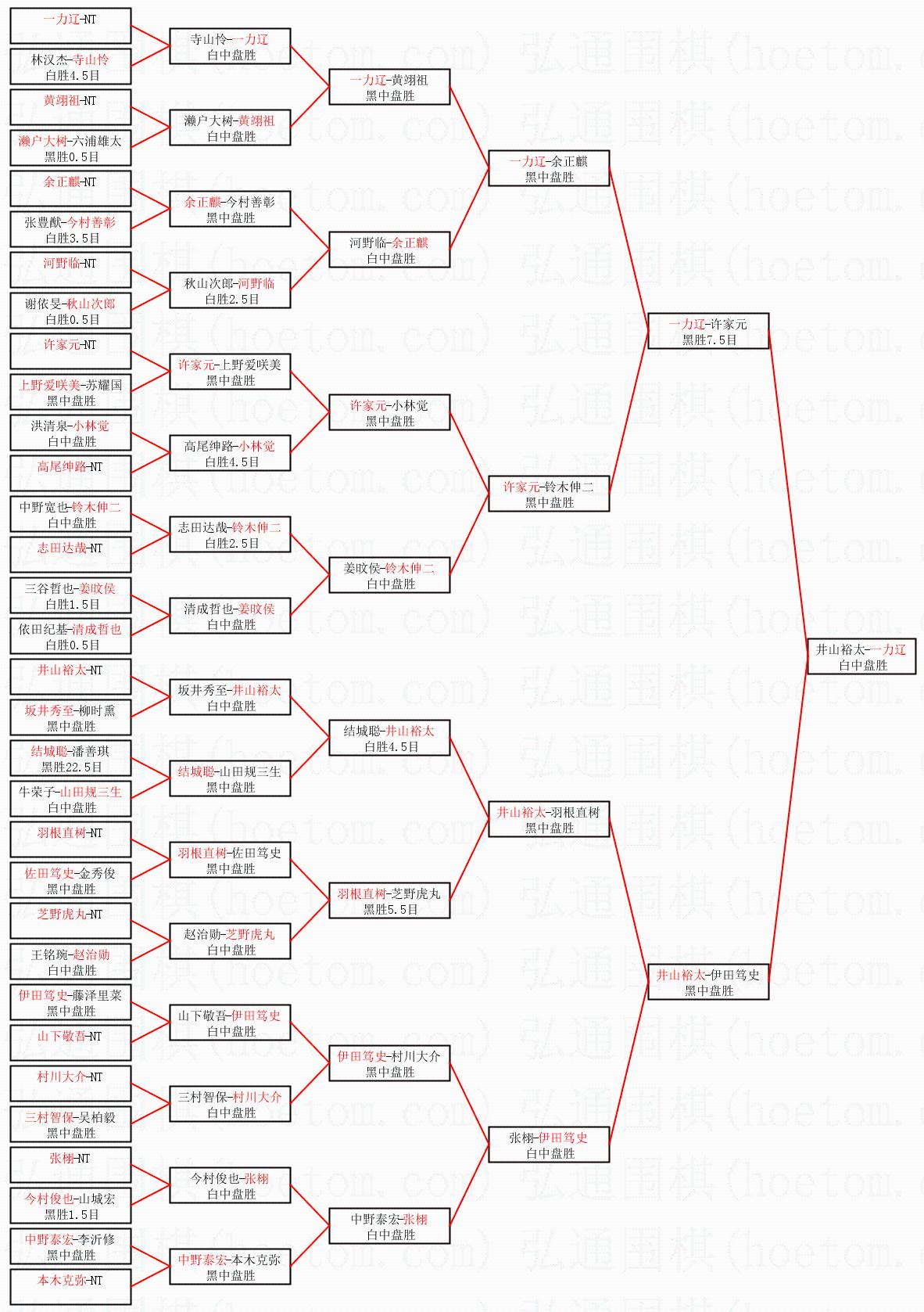 1.一力辽获得冠军,井山裕太获得亚军。决赛比分:一力辽1:0井山裕太。棋局: