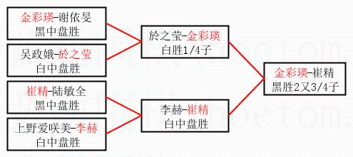 1.金彩瑛获得冠军,崔精获得亚军。决赛比分:金彩瑛2:0崔精。棋局: