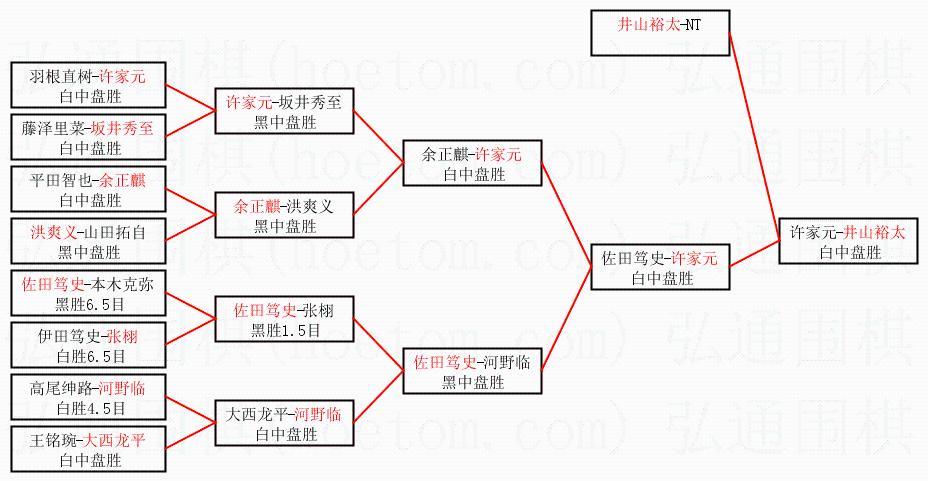 1.井山裕太获得冠军,许家元获得亚军。决赛比分:井山裕太3:2许家元。棋局: