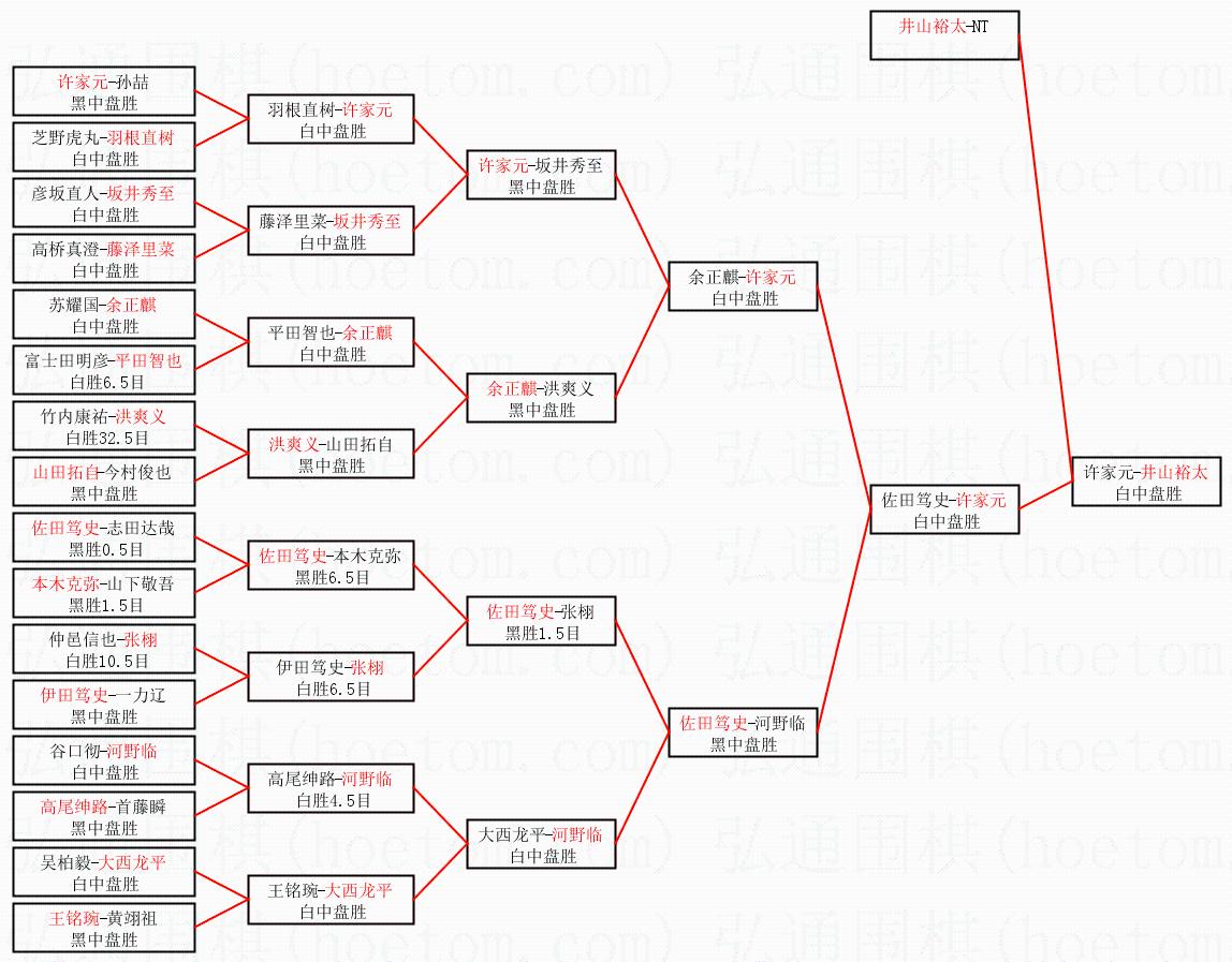 1.井山裕太获得冠军,许家元获得亚军。决赛比分:井山裕太3:2许家元。棋局: