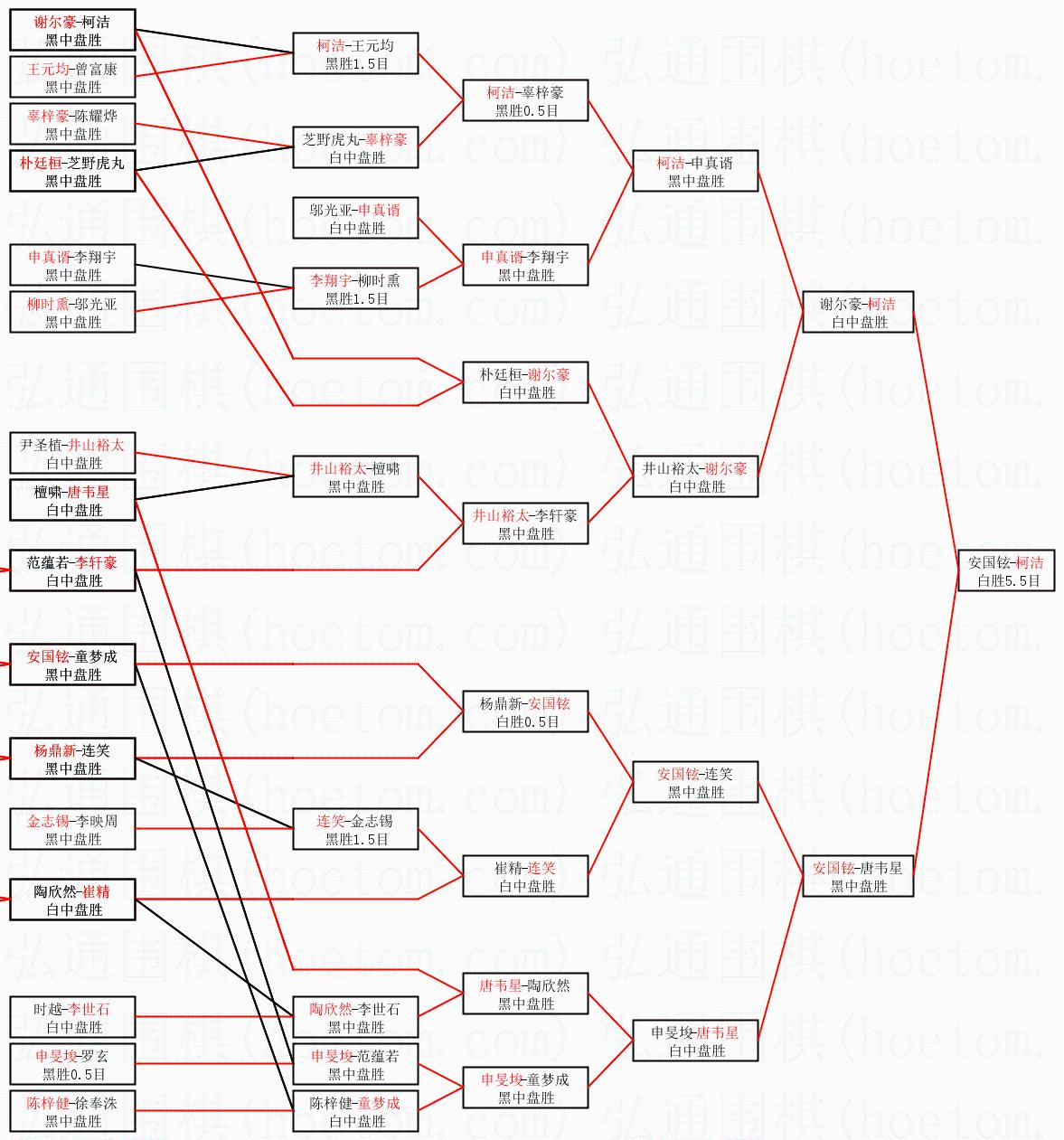 1.柯洁获得冠军,安国铉获得亚军。决赛比分:柯洁2:1安国铉。棋局: