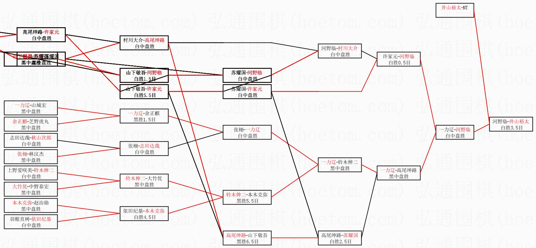 1.井山裕太获得冠军,河野临获得亚军。决赛比分:井山裕太4:2河野临。棋局: