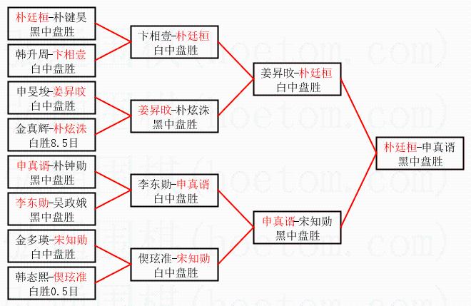 | 1.朴廷桓获得冠军,申真谞获得亚军。决赛比分:朴廷桓2:1申真谞。棋局: | ||