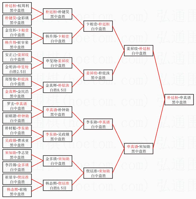 | 1.朴廷桓获得冠军,申真谞获得亚军。决赛比分:朴廷桓2:1申真谞。棋局: | ||