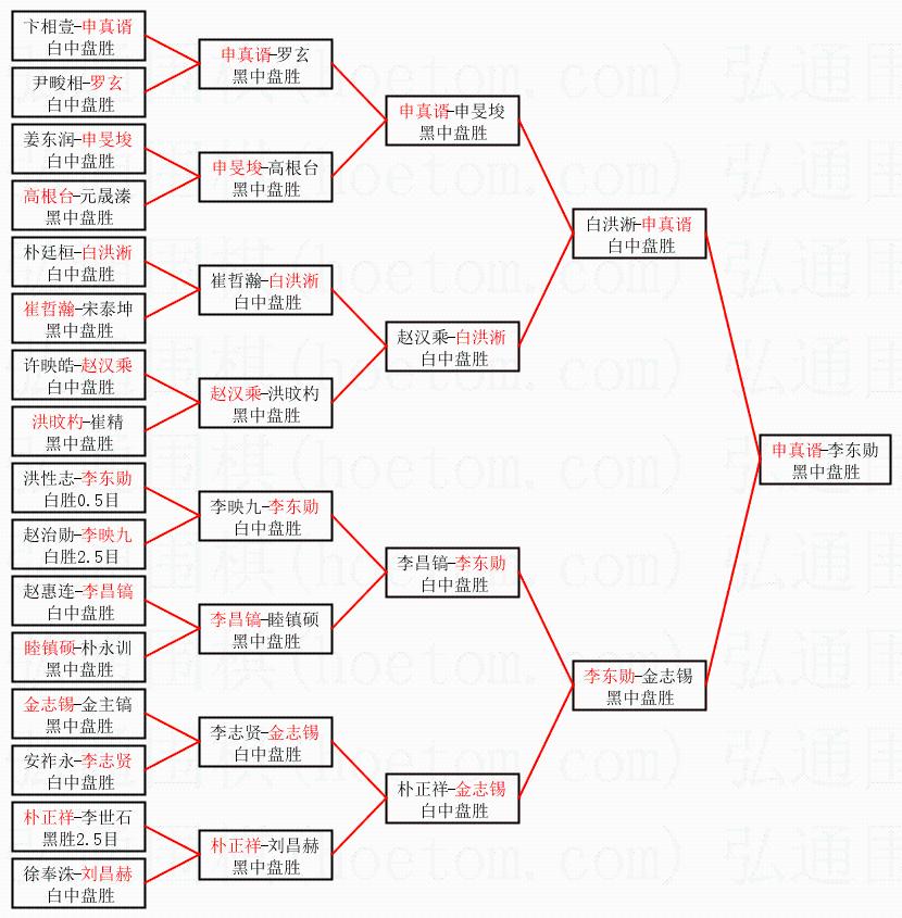 1.申真谞获得冠军,李东勋获得亚军。决赛比分:申真谞2:1李东勋。棋局: