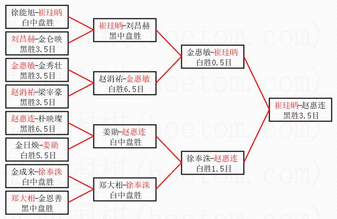 1.崔珪昞获得冠军,赵惠连获得亚军。决赛比分:崔珪昞1:0赵惠连。棋局: