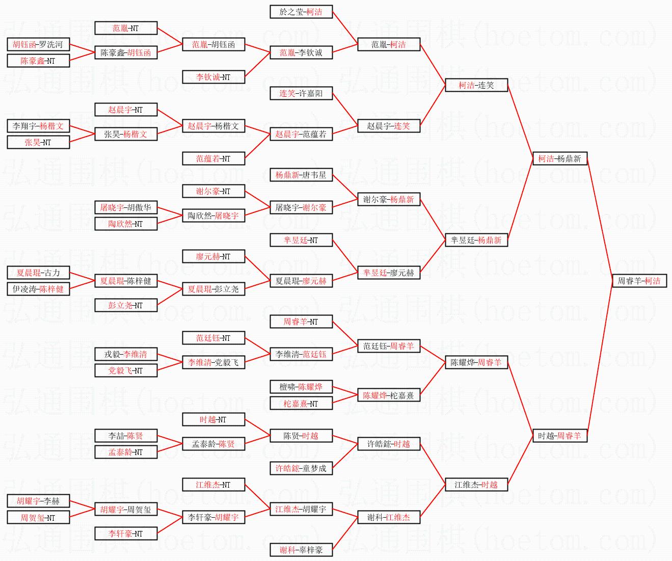 | 1.柯洁获得冠军,周睿羊获得亚军。决赛比分:柯洁2:0周睿羊。棋局: | ||