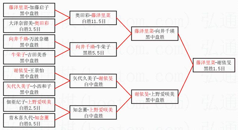 1.藤泽里菜获得冠军,谢依旻获得亚军。决赛比分:藤泽里菜1:0谢依旻。棋局: