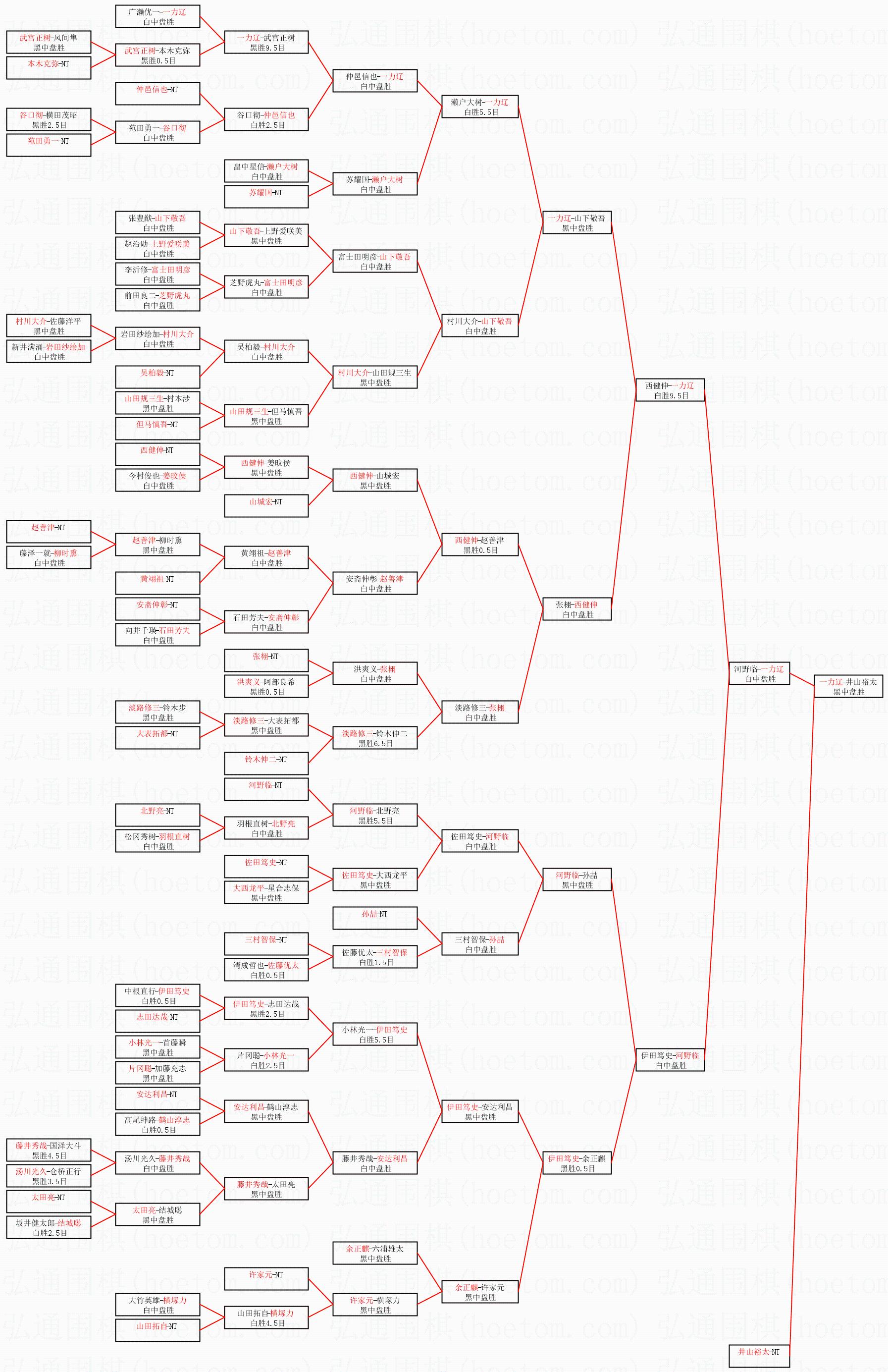 1.一力辽获得冠军,井山裕太获得亚军。决赛比分:一力辽3:2井山裕太。棋局: