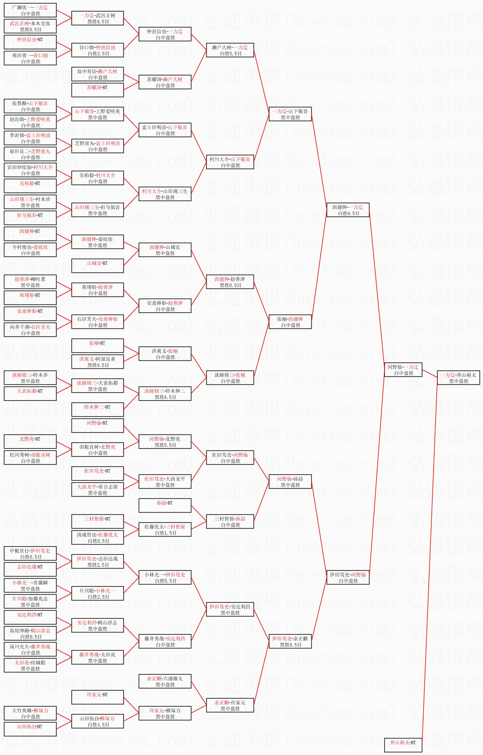 1.一力辽获得冠军,井山裕太获得亚军。决赛比分:一力辽3:2井山裕太。棋局: