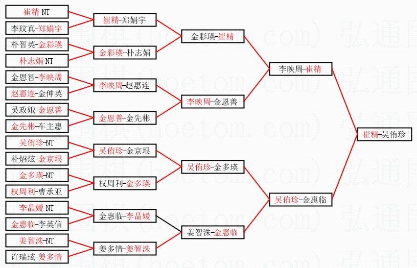 1.崔精获得冠军,吴侑珍获得亚军。决赛比分:崔精2:0吴侑珍。棋局: