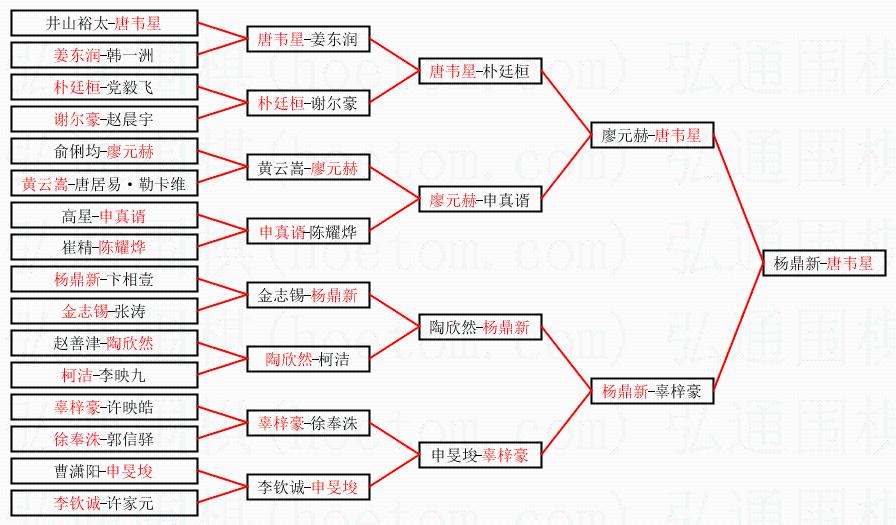 1.唐韦星获得冠军,杨鼎新获得亚军。决赛比分:唐韦星2:1杨鼎新。棋局: