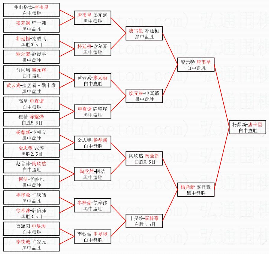 1.唐韦星获得冠军,杨鼎新获得亚军。决赛比分:唐韦星2:1杨鼎新。棋局: