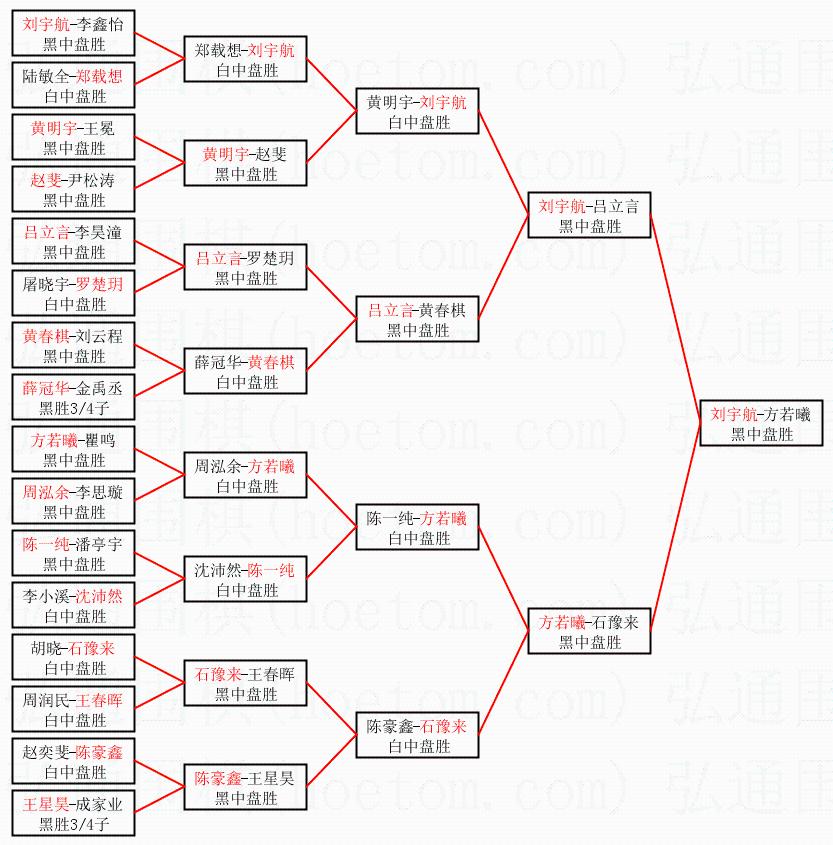 1.刘宇航获得冠军,方若曦获得亚军。决赛比分:刘宇航1:0方若曦。棋局: