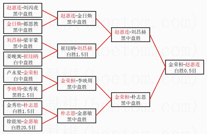 1.赵惠连获得冠军,金荣桓获得亚军。决赛比分:赵惠连1:0金荣桓。棋局: