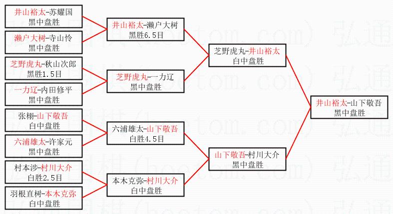 3.下半区半决赛山下敬吾获胜,比分:山下敬吾1:0村川大介。棋局: