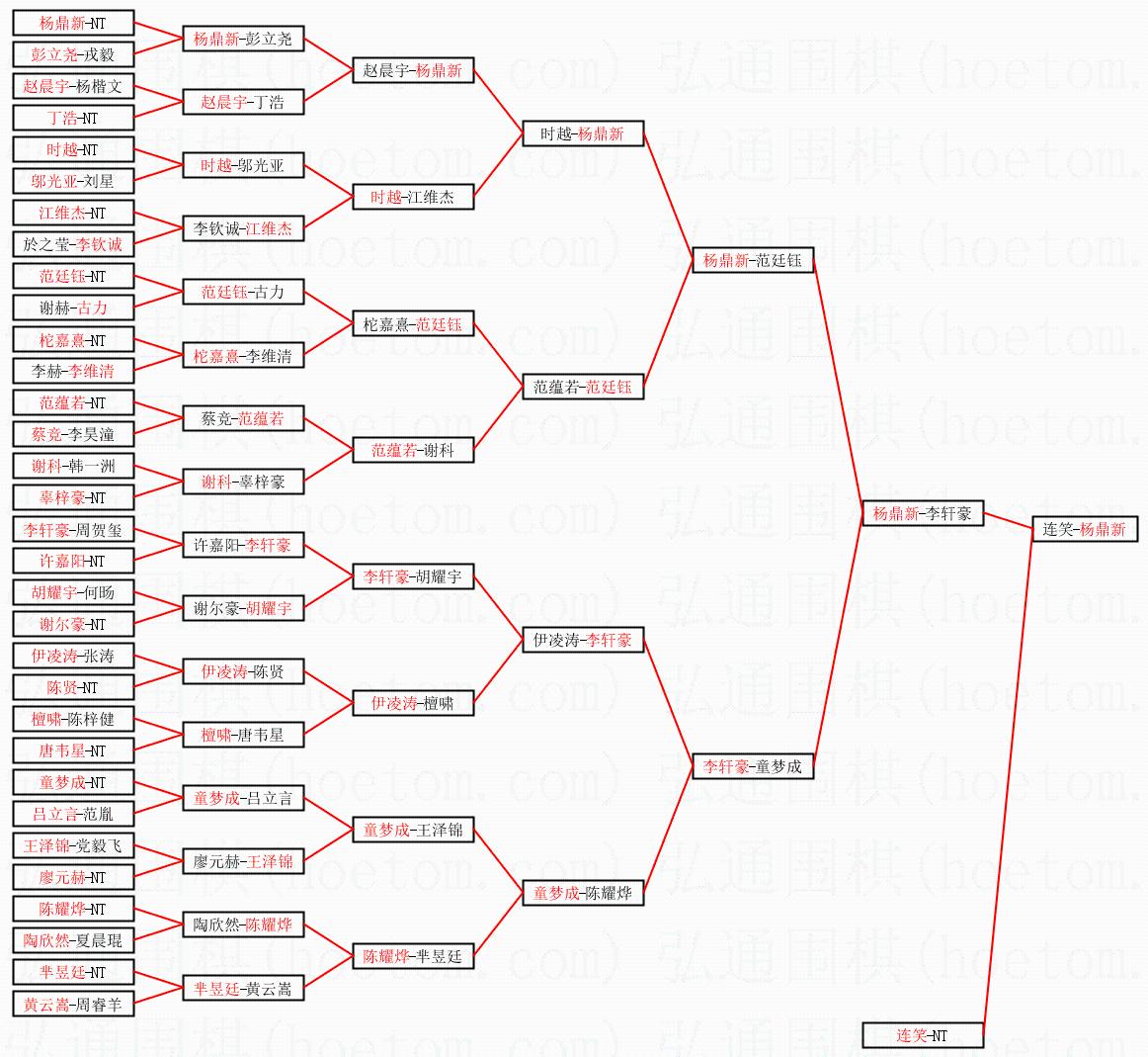 1.杨鼎新获得冠军,连笑获得亚军。决赛比分:杨鼎新2:1连笑。棋局: