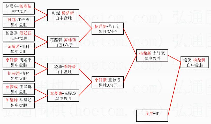 1.杨鼎新获得冠军,连笑获得亚军。决赛比分:杨鼎新2:1连笑。棋局: