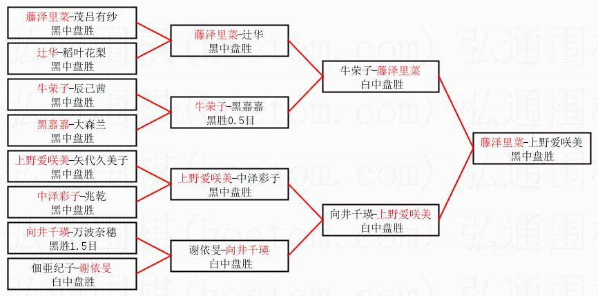 1.藤泽里菜获得冠军,上野爱咲美获得亚军。决赛比分:藤泽里菜1:0上野爱咲美。棋局: