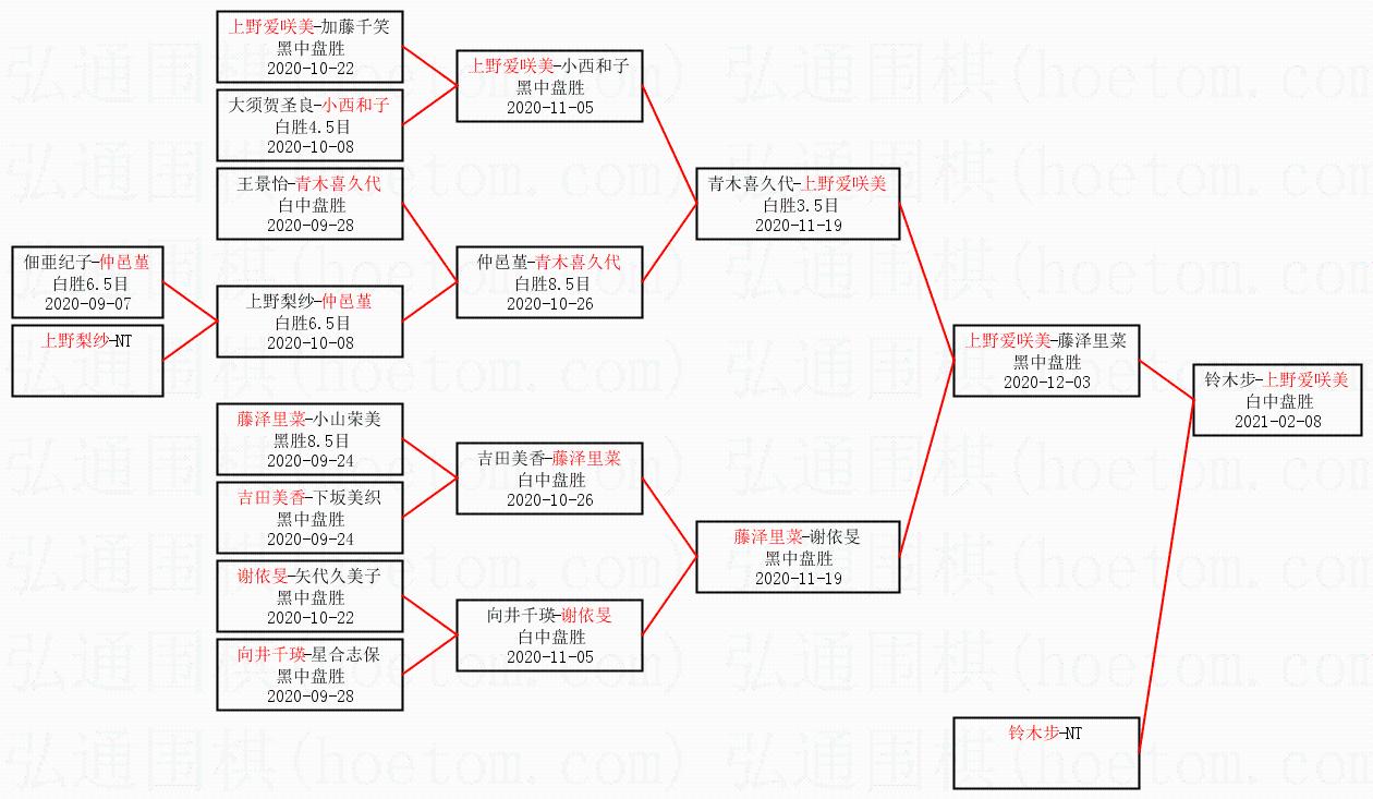 1.上野爱咲美获得冠军,铃木步获得亚军。决赛比分:上野爱咲美2:1铃木步。棋局: