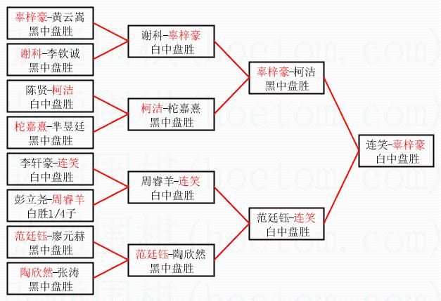 1.辜梓豪获得冠军,连笑获得亚军。决赛比分:辜梓豪1:0连笑。棋局: