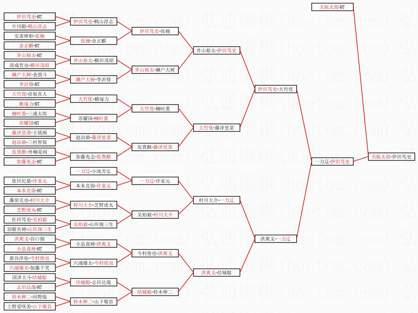 1.关航太郎获得冠军,伊田笃史获得亚军。决赛比分:关航太郎3:2伊田笃史。棋局: